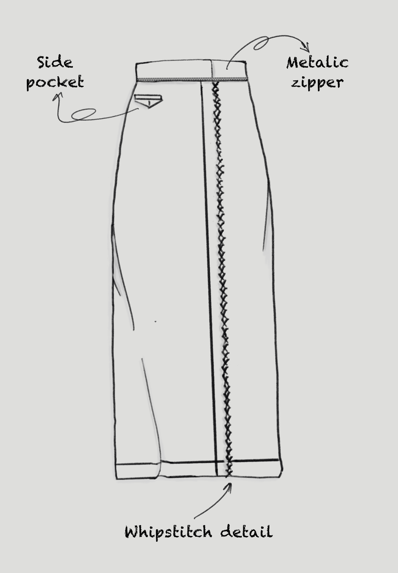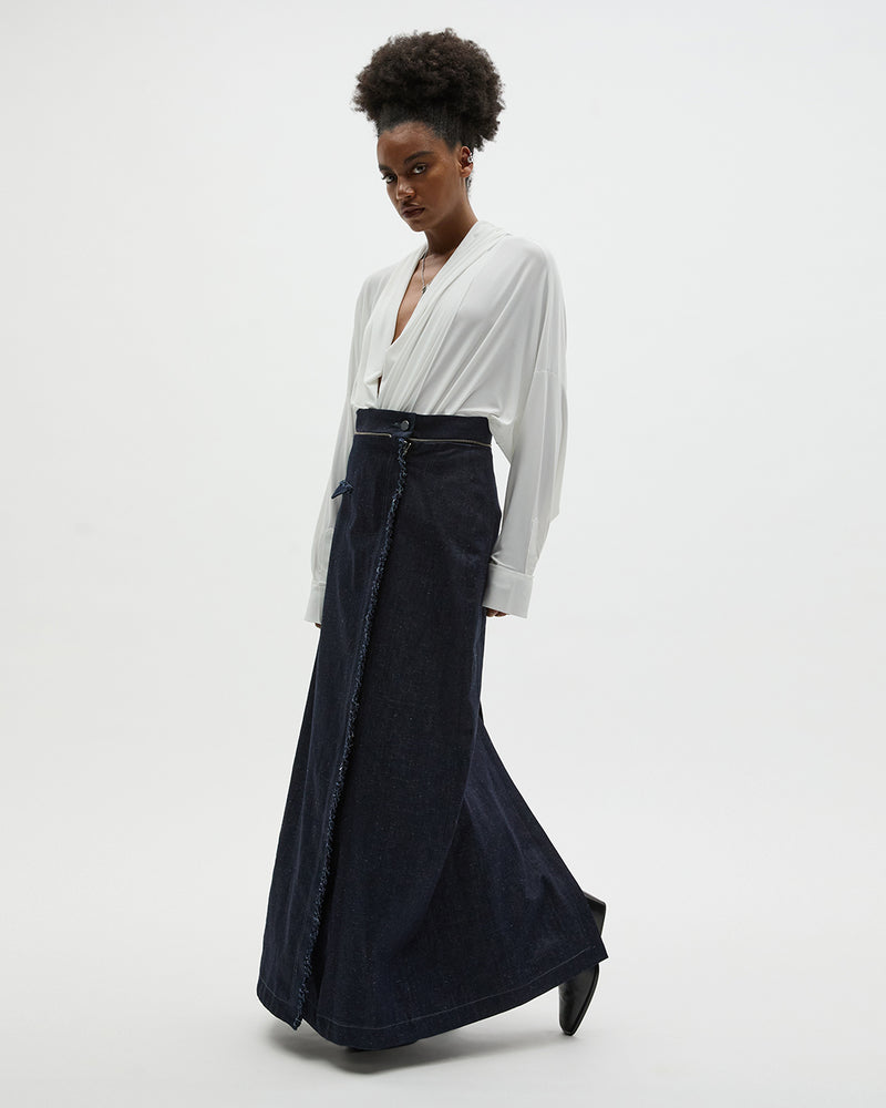 A thoughtfully designed system of detachable elements allows the full-length trench coat to transform into a cropped jacket and a separate skirt through discreet, high-quality zippers.