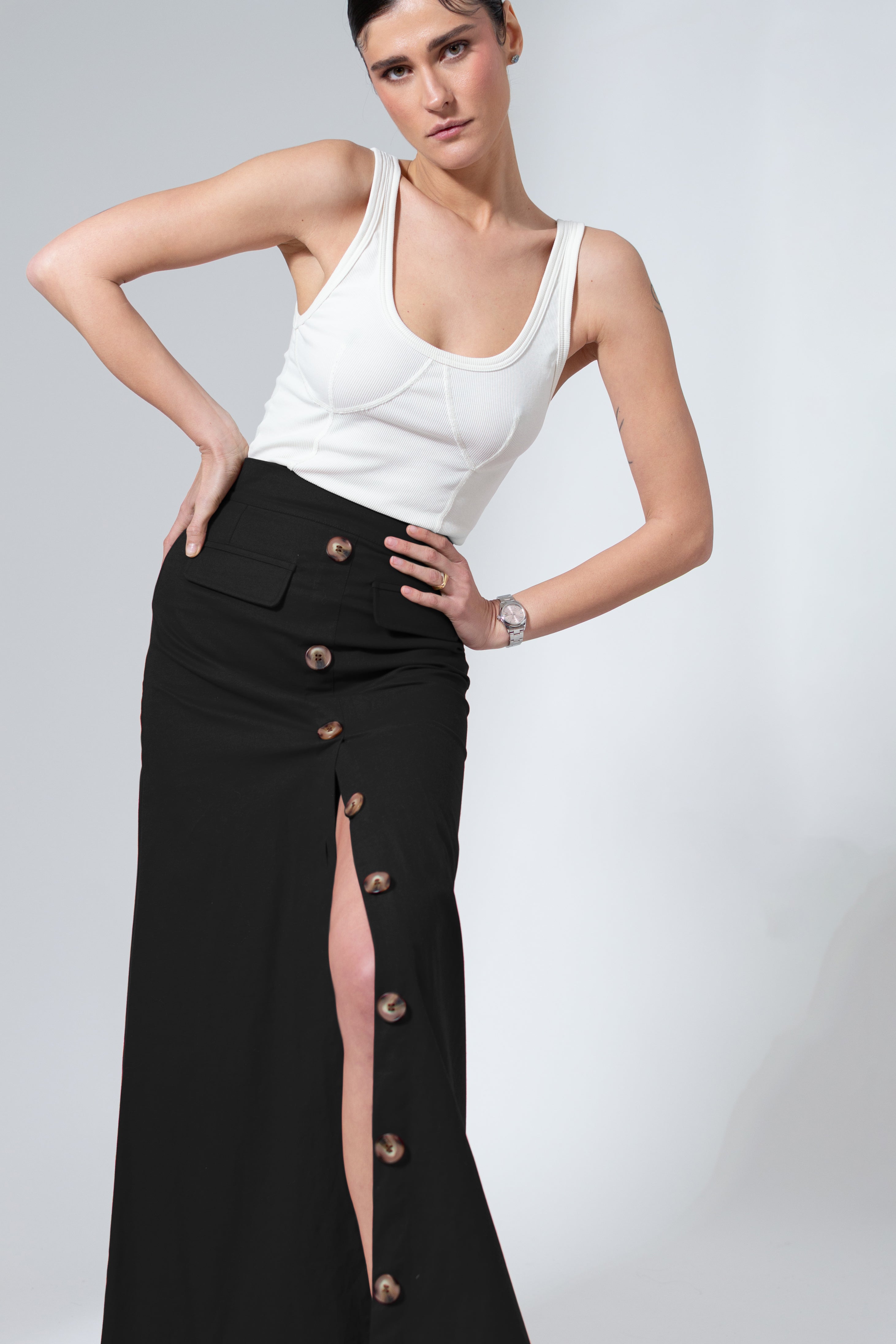 Black Linen Maxi Skirt  With High Waist Front Slit and Buttons - Custom Made - Bastet Noir